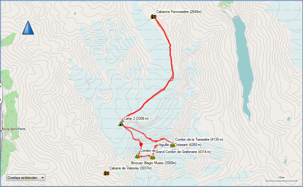 sehr lang. Daher bietet es sich an, dass wir diesen in zwei Abschnitte unterteilen und möglichst nahe an der NordWest Flanke biwakieren. Das sollte uns dann in die Lage versetzen alle drei Gipfel des Maßives an einem Tag zu erreichen und soweit abzusteigen, dass wir am vierten Tag den Talort erreichen.